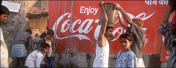 Coca Cola in India ← Previous Next → Poor people fetching water from a communal well emblazoned with Coca Cola advertisement.