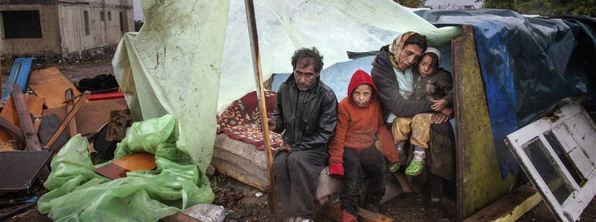 A Roma family of turkish origin sits under an improvised shelter to protect from heavy rain in Eforie Sud, Romania, on September 30, 2013 before an annoucement by the Mayor on their case. Romanian authorities evicted around 100 Roma from a town near the Black Sea coast without providing them with alternative housing, prompting criticism from Amnesty International. The Roma families spent three days in a nearby field despite the cold weather until the mayor decided on September 30, 2013 to host them in an old school.