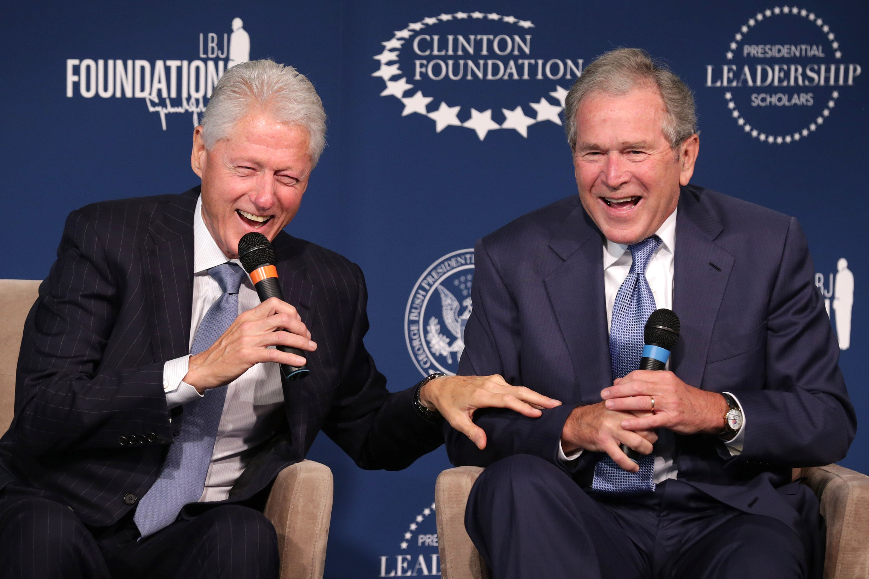 WASHINGTON, DC – SEPTEMBER 08: Former U.S. presidents Bill Clinton (L) and George W. Bush share a laugh during an event launching the Presidential Leadership Scholars program at the Newseum September 8, 2014 in Washington, DC. With the cooperation of the Clinton, Bush, Lyndon B. Johnson and George H. W. Bush presidential libraries and foundations, the new scholarship program will provide ‘motivated leaders across all sectors an opportunity to study presidential leadership and decision making and learn from key administration officials, practitioners and leading academics.’ (Photo by Chip Somodevilla/Getty Images)