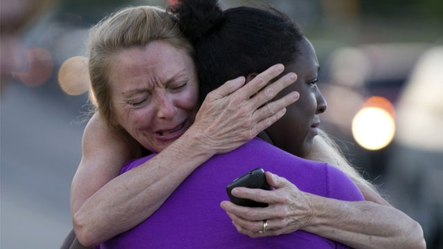 Survivors comfort each other following the Aurora mass shooting. Photo Getty Images. ← Previous Next →