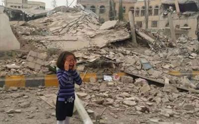 Yemeni child cries at a site of a Saudi air strikes, Sept 2015. Source Al Jazeera.