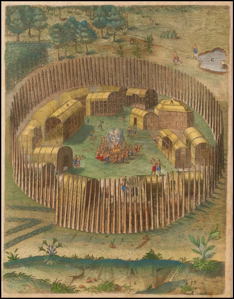 Native American Village of Pomeiooc by Theodore De Bry, 1590.