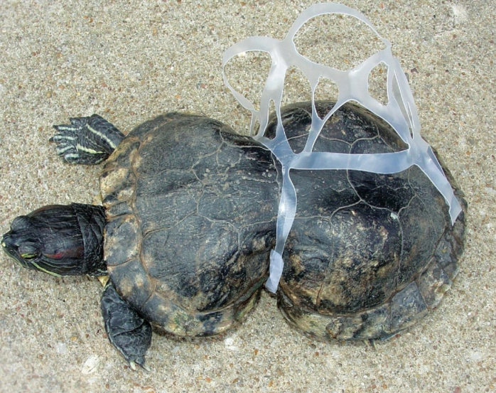 Tortoise strangled by plastic beverage holder. Source VICE Netherlands.