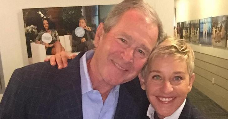 Ellen Degeneres embraces George W. Bush. Photo from The Ellen Show.