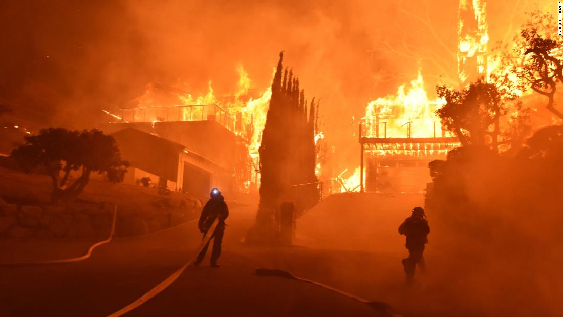 In this photo provided by the Ventura County Fire Department, firefighters work to put out a blaze burning homes early Tuesday, Dec. 5, 2017, in Ventura, Calif. Authorities said the blaze broke out Monday and grew wildly in the hours that followed, consuming vegetation that hasn’t burned in decades. (Ryan Cullom/Ventura County Fire Department via AP)
