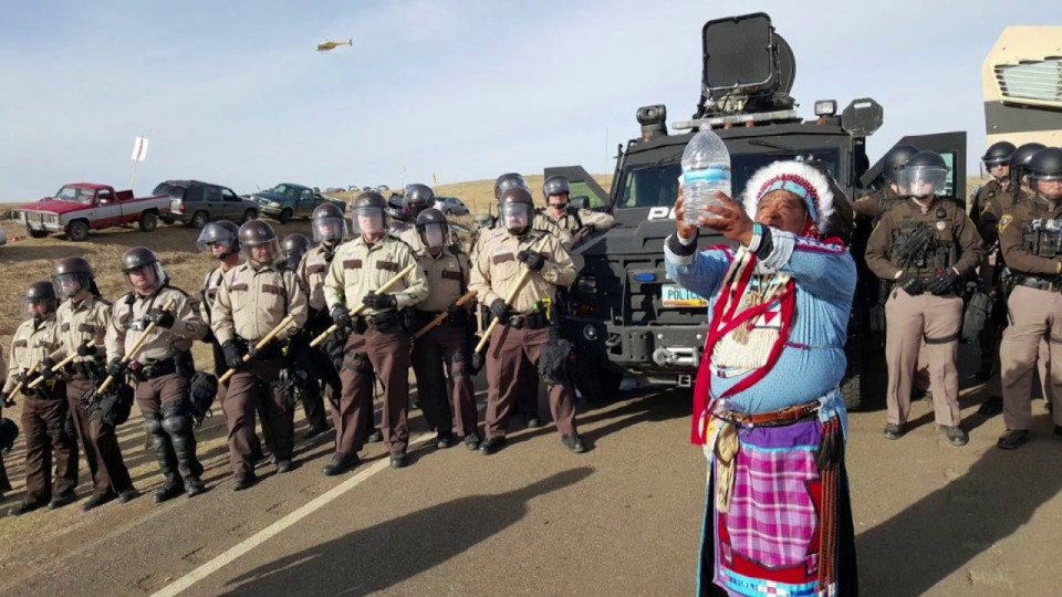 Chase Iron Eyes prays for the earths water with police lined up behind him at Standing Rock Sioux. ← Previous