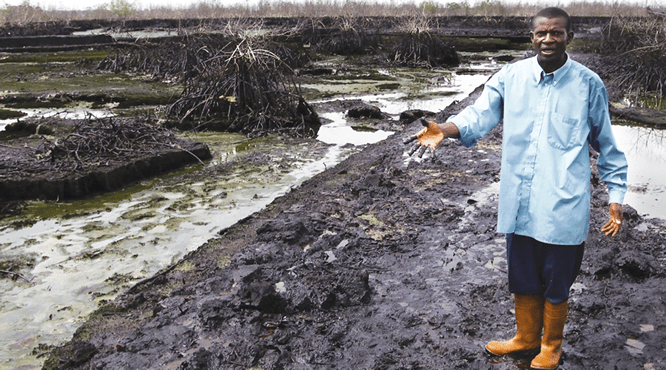 Oil pollution by Royal Dutch Shell in the Niger Delta has devastated indigenous communities like the Ogoni. Photo source Amnesty International. Next →