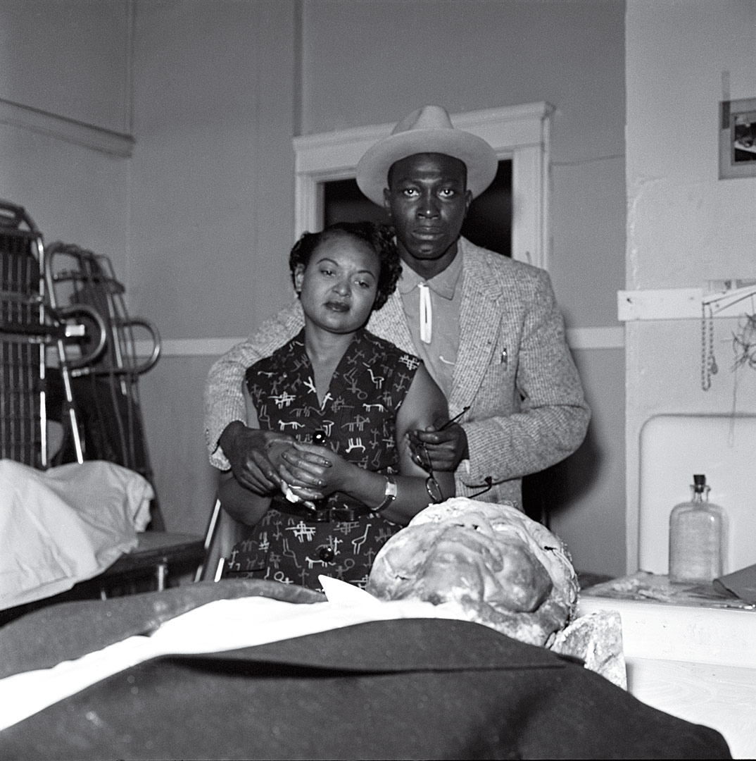 The body of Emmett Till with his mother in background.