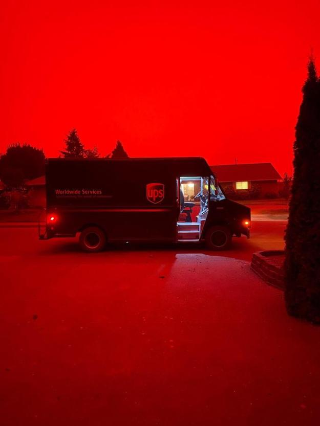 A UPS truck in the red glow of wildfire on the west coast, 2020. Stock footage.