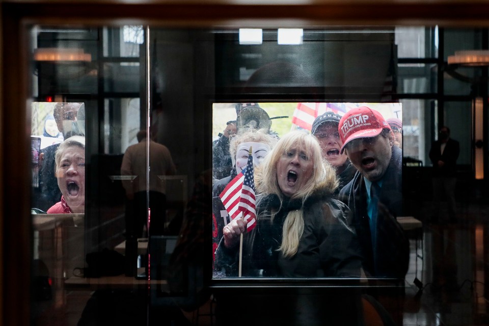 Protesters stand outside the Statehouse Atrium where reporters listen during the State of Ohio’s Coronavirus response update on Monday, April 13, 2020 at the Ohio Statehouse in Columbus, Ohio. About 100 protesters assembled outside the building during Gov. Mike DeWine’s weekday update on the state’s response to the COVID-19 pandemic, upset that the state remains under a Stay-At-Home order and that non-essential businesses remain closed. (Joshua A. Bickel/The Columbus Dispatch via AP)