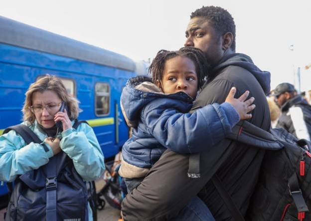 *Photograph is of an African father attempting to flee Ukraine and is by Umit Bektas of Reuters.