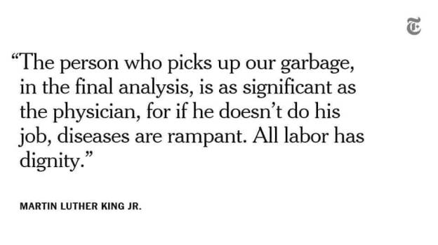 “You are doing many things here in this struggle. You are demanding that this city will respect the dignity of labor. So often we overlook the work and the significance of those who are not in professional jobs, of those who are not in the so-called big jobs. But let me say to you tonight, that whenever you are engaged in work that serves humanity and is for the building of humanity, it has dignity, and it has worth. One day our society must come to see this. One day our society will come to respect the sanitation worker if it is to survive, for the person who picks up our garbage, in the final analysis, is as significant as the physician, for if he doesn’t do his job, diseases are rampant. All labor has dignity.”