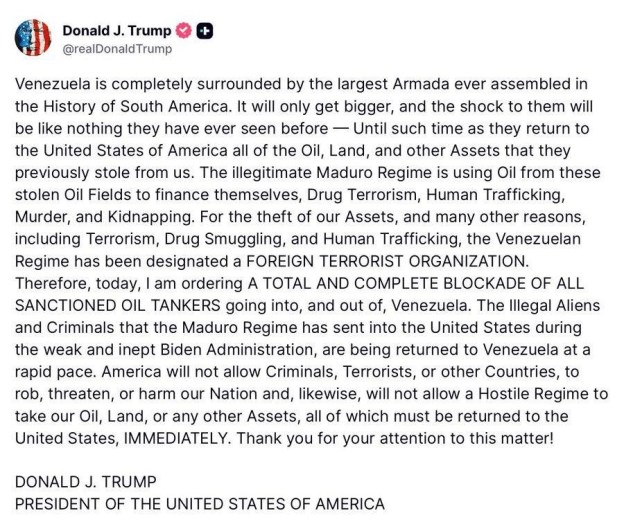 Trump’s racism allows no space for Venezuelans to have agency over their own lives. Indeed, as he talks about taking their oil, he demonizes those Venezuelans who seek a better life in the US. This is a regime that has murdered scores of civilians, many of them fishermen, in the Caribbean on the basis of a lie. Now it is using the term “terrorism” to justify any act of military violence. So, it is abundantly clear what this is all about to all but those still brainwashed by the cult of MAGA and American exceptionalism.