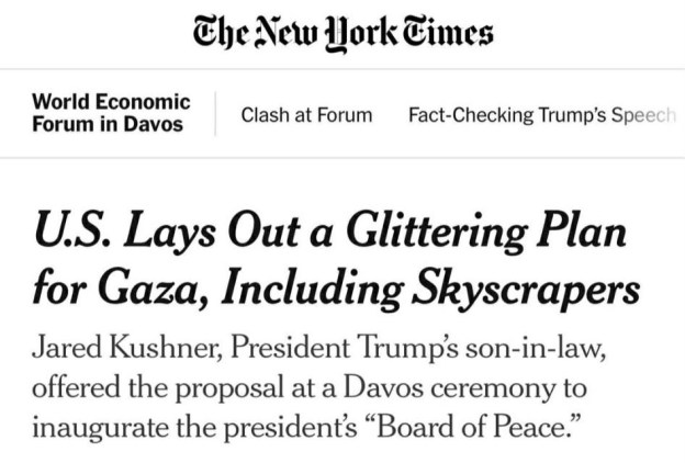 Gaza is the template for what the powerful plan for the rest of us. Canadian Prime Minister, Mark Carney, said in his speech in Davos that “if we’re not at the table, we’re on the menu.” He was talking about the so-called “middle powers.” But the stark reality is that most of us will never be invited to the party. And if we are, it will be through the kitchen door and straight into the oven.