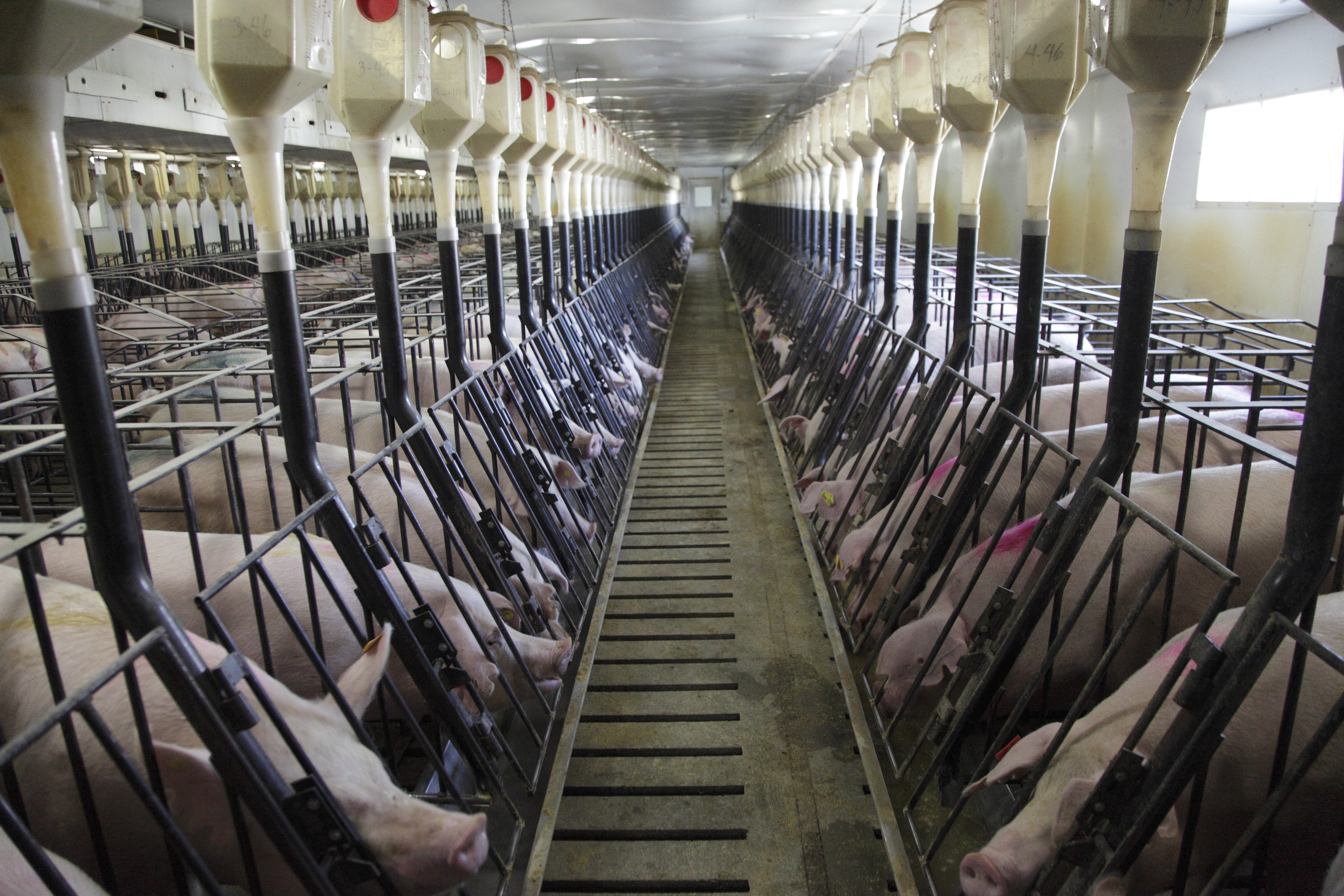 29 Apr 2012, USA — Sows feed at Whiteshire Hamroc farm in Albion, Indiana, on March 16, 2012. The farm specializes in raising breeding swine for other agribusiness operations. Such breeding pigs have become a hot commodity in China, where the country is scrambling to ramp up its domestic livestock industry and keep up with demand for a meat-rich diet. —(Copyright John Gress/Corbis / APImages)