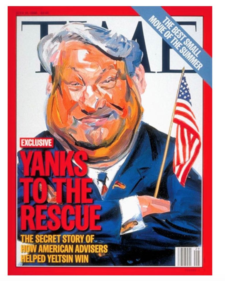 Cover of Time Magazine regarding the US influence on Russian elections and Boris Yeltsin. ← Previous Next →