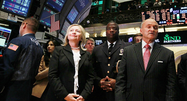 NEW YORK, NY – SEPTEMBER 09: U.S. Secretary of State Hillary Clinton (C), and New York City Police Commissioner Ray Kelly (L) walk on the floor of the New York Stock Exchange after the ringing of the opening bell on September 9, 2011 in New York City. U.S. Secretary of State Hillary Clinton along with other New York leaders rang the opening bell at the NYSE ahead of the tenth anniversary of the September 11 terror attacks. (Photo by Justin Sullivan/Getty Images)