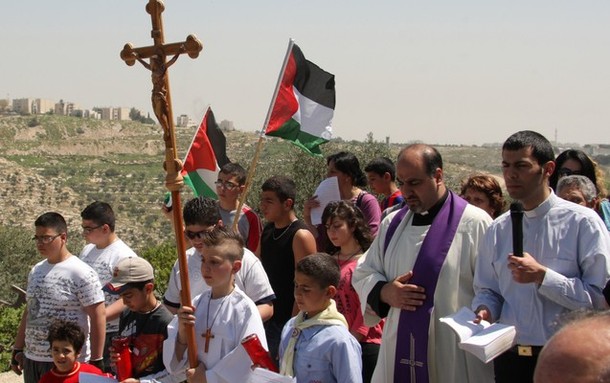 Palestinian priest Father Shomali (2R) leads an open air mass on April 6, 2012 after leading a procession through the Cremisan valley and near the surrounding settlements, with Palestinian Christians who didn’t get permits to go to Jerusalem to participate in the “Via Dolorosa” in Jerusalem. Christian pilgrims mark the anniversary of the crucifixion of Christ by walking along the path where Jesus walks, now known as the “Via Dolorosa” or the “Way of Suffering”. AFP PHOTO/MUSA AL SHAER (Photo credit should read MUSA AL-SHAER/AFP/Getty Images)